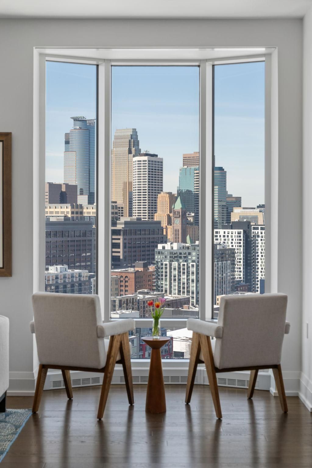 This highly sought-after 2 bedroom plus den floorplan in the coveted northwest corner residence at Eleven on the River offers panoramic views of the Mississippi River, Stone Arch Bridge, and Minneapolis skyline. Throughout the home there are remarkable views, exceptional natural light, and a seamless blend of luxury and functionality.The elegant open chef's kitchen is anchored by a large center island topped with Carrara marble countertops and accented by the handcrafted rift-sawn white oak cabinetry, premium Wolf appliances including a range, wall oven, steam oven, and microwave, integrated paneled Sub-Zero refrigeration, and full height backsplash. The adjacent great room offers stunning views from the bay window, upgraded chic gas fireplace, and access to the 195 sq ft private covered loggia with built-in heaters, allowing for year-round indoor/outdoor living and maximal enjoyment. The home features two bedroom suites, with the owners suite boasting an attached spa-like bath with heated marble tile floors, a Seura in-mirror TV, and custom closets installed by Twin Cities Closet Company. Every detail of the home has been considered, from the custom bar niche built with custom white oak cabinetry, to the high end lighting selection and art spotlights, to the built-in Sonos system, and motorized Lutron room darkening shades. Two heated garage stalls are included in purchase, both equipped with EV charging stations. Eleven on the River allows for easy access to the culturally vibrant Mill District, and features world class amenities. The top of the line fitness center includes heated outdoor lap pool, spa, indoor sports court, yoga studio, steam and sauna. Leisure spaces include billiards lounge, library, resident lounge, display kitchen with private dining room, and board room. Full services include Front Desk concierge service, available guest suites, and available auxiliary units for those searching for additional studio or work space, and private dog park and pet spa. This is an exceptional opportunity to own one of the premier residences within one of Minneapolis' most architecturally significant luxury buildings.