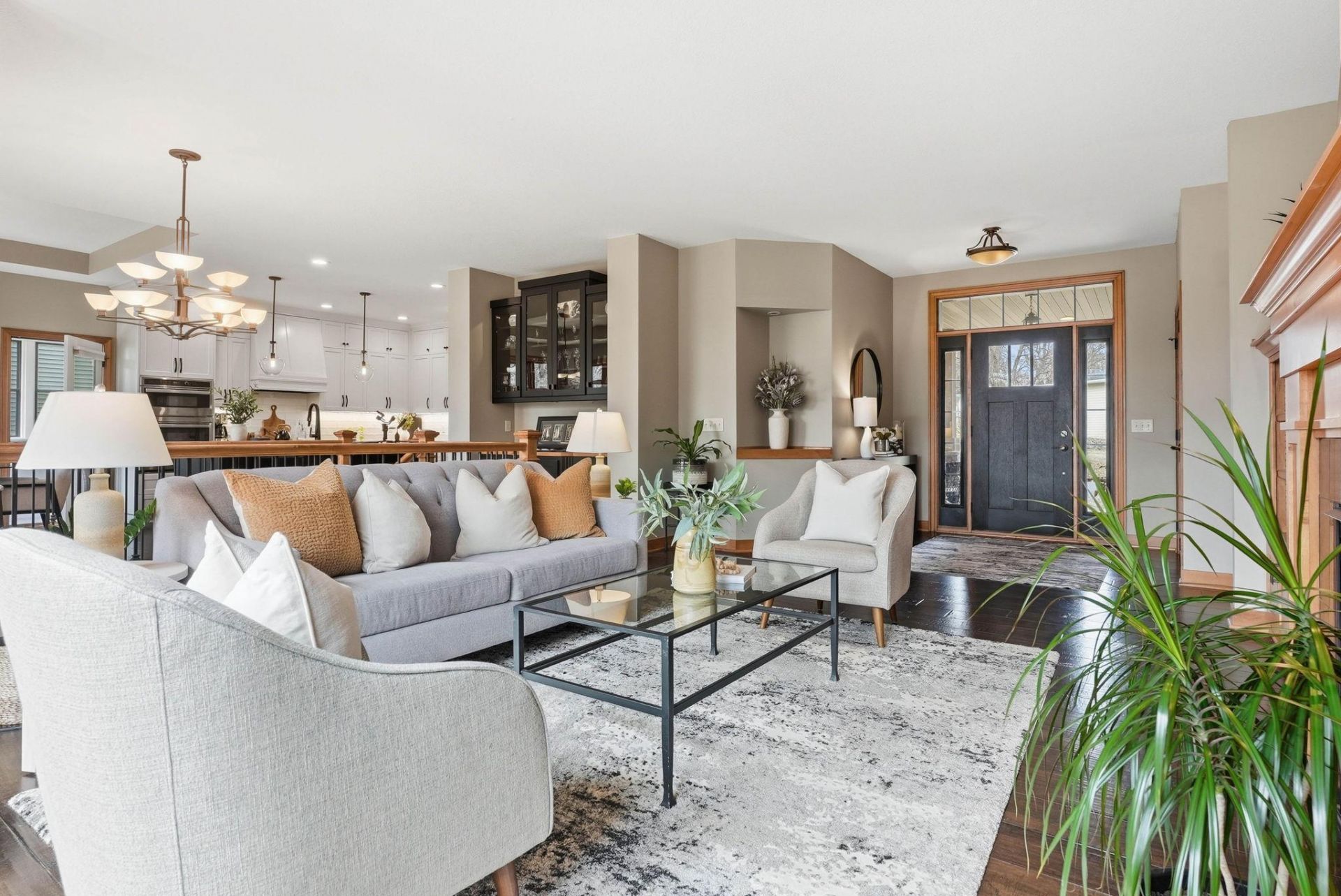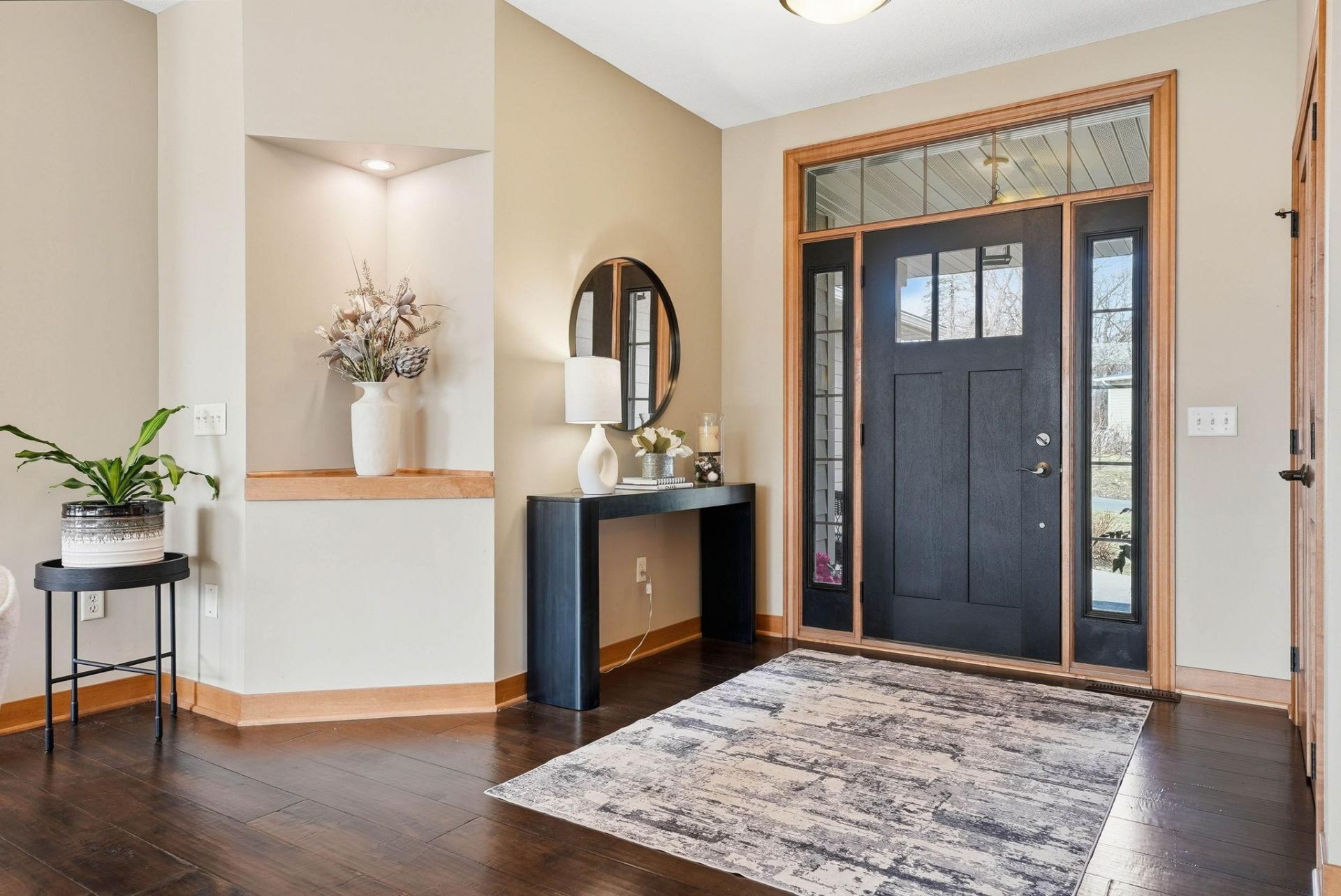 Welcome to this well-maintained walkout rambler in the award winning Mounds View school district offering 5 bedrooms, 4 bathrooms, and a spacious, thoughtfully updated layout designed for both everyday living and entertaining. Built in 2008 and extensively improved since, this home stands out for its level of care, quality updates, and a true sense of confidence for the next owner. Set on a quiet street with minimal traffic, the property offers a private, peaceful setting with frequent wildlife and a subtle 'up north feel while remaining close to everyday amenities. Step inside to an inviting entry with hardwood floors, built-in storage, and a functional drop zone, opening into a bright main living area with 9-foot ceilings and seamless flow throughout. The fully remodeled kitchen ('22) features custom cabinetry with built-in storage solutions and quartz countertops, creating a clean, elevated feel while connecting effortlessly to the dining area, 3-season porch, and expanded deck overlooking a private backyard with no rear neighbors. Just off the garage, the mudroom and laundry area is thoughtfully designed with additional storage and quartz countertops, offering a polished and highly functional everyday space. The main level also includes a flexible bedroom or office, a full bath, and a remodeled primary suite with double vanity, quartz countertops, new tile, and separate tub and shower. The walkout lower level features a large family room with gas fireplace, built-ins, and wet bar, along with additional bedrooms/flex space?each with walk-in closets?and a remodeled ¾ bathroom ('25). Extensive updates include new landscaping ('25), furnace and water heater ('25), carpet throughout ('25), and roof ('22), reinforcing a move-in-ready home where major items have already been addressed. Additional highlights include a 3½-car insulated, extra-deep garage, pre-wired surround sound, sprinkler-ready setup, and abundant storage. Enjoy nearby lakes, parks, trails, shopping, and dining, with quick access to both downtown Minneapolis and St. Paul. This home offers a rare combination of space, updates, privacy, and peace of mind. Don't miss out!